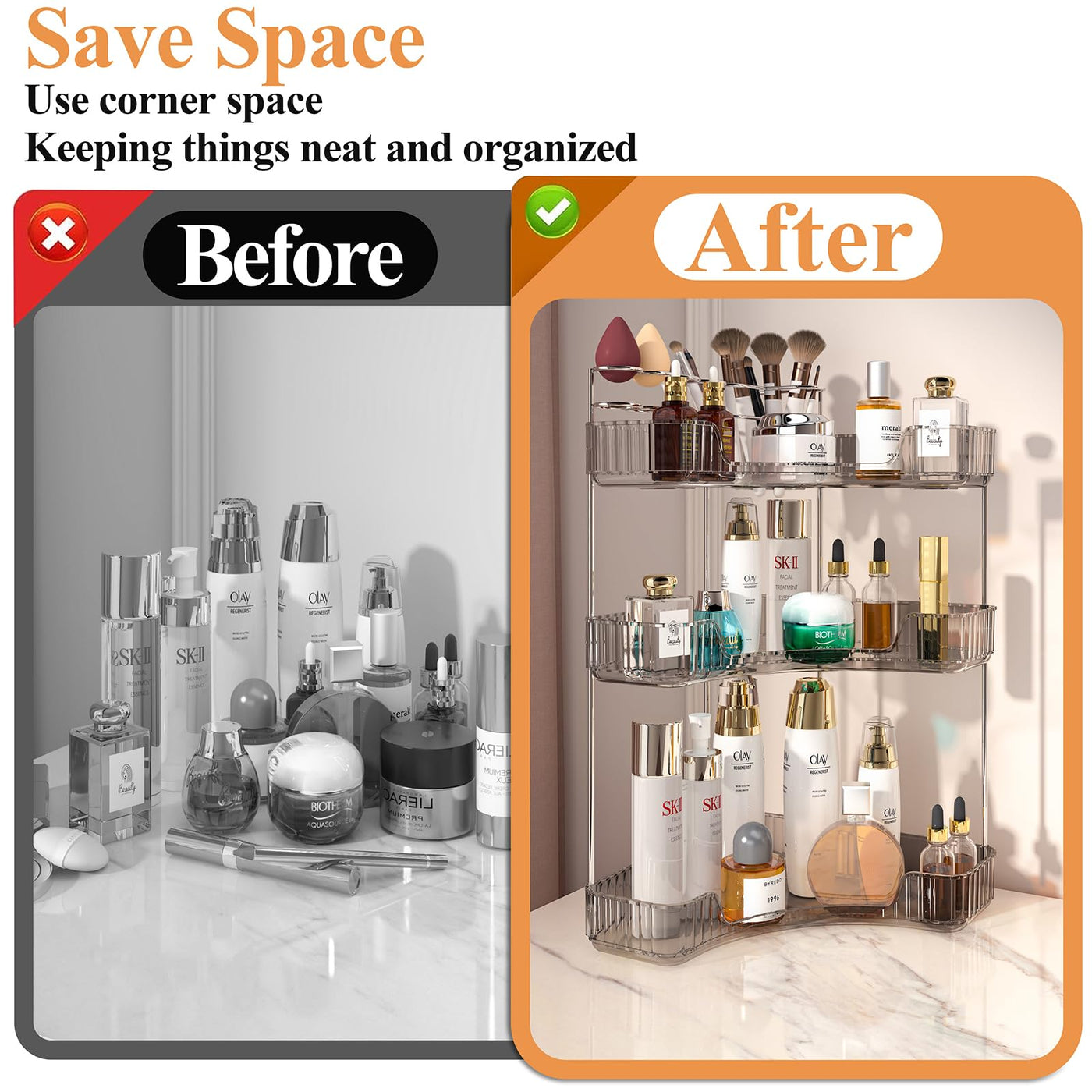 Q: Can I use this organizer for makeup brushes and skincare products?A: Absolutely! The SUNZOS 3-Tier Organizer features a built-in makeup brush holder, allowing you to store beauty sponges, makeup brushes, and skincare products all in one convenient location.