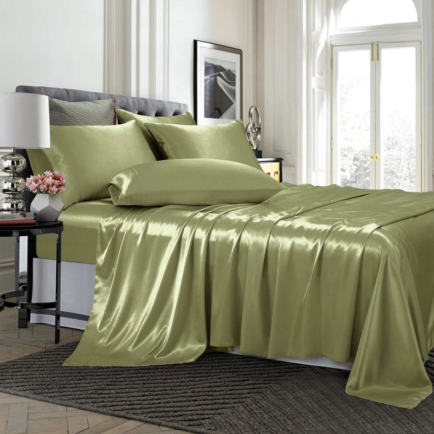 Treely Satin Bed Sheets 6 Piece,Hotel Luxury Silky Full Sheet Sets With Deep Pocket,Fitted Sheet - Olive Green Full Sheets,1 Fla