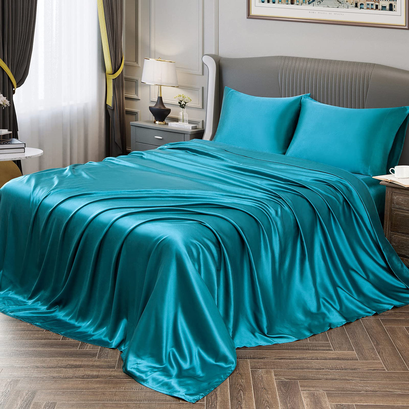 Vonty Satin Sheets Full Size Silky Soft Satin Bed Sheets Teal Satin Sheet Set, 1 Deep Pocket Fitted Sheet + 1 Flat Sheet + 2 Pil