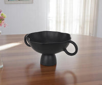The 11-inch black metal round pedestal centerpiece bowl is the perfect addition to your living space. This modern and unique bowl features an organically shaped imperfect rim and a smooth matte finish. A pedestal base adds a touch of refinement and sophistication. Not for intended for direct food contact, this bowl is for decorative display use or as a stand-alone dcor piece. 6.75-inch h x 11.22-inch w x 15.55-inch d.