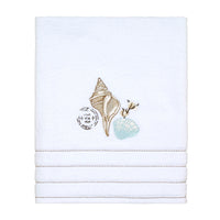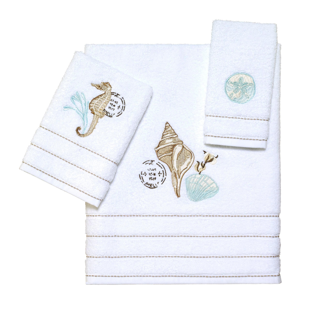 The Avanti Farmhouse Shell Bath Towel Is Embroidered With Shells, A Postmark And Cotton Vine In Light Blue And Beige On A 100% Cotton White Terry Towel. The Towel Is Bordered With 4 Taupe Broken Horizontal Polyester Stripes. Imported.