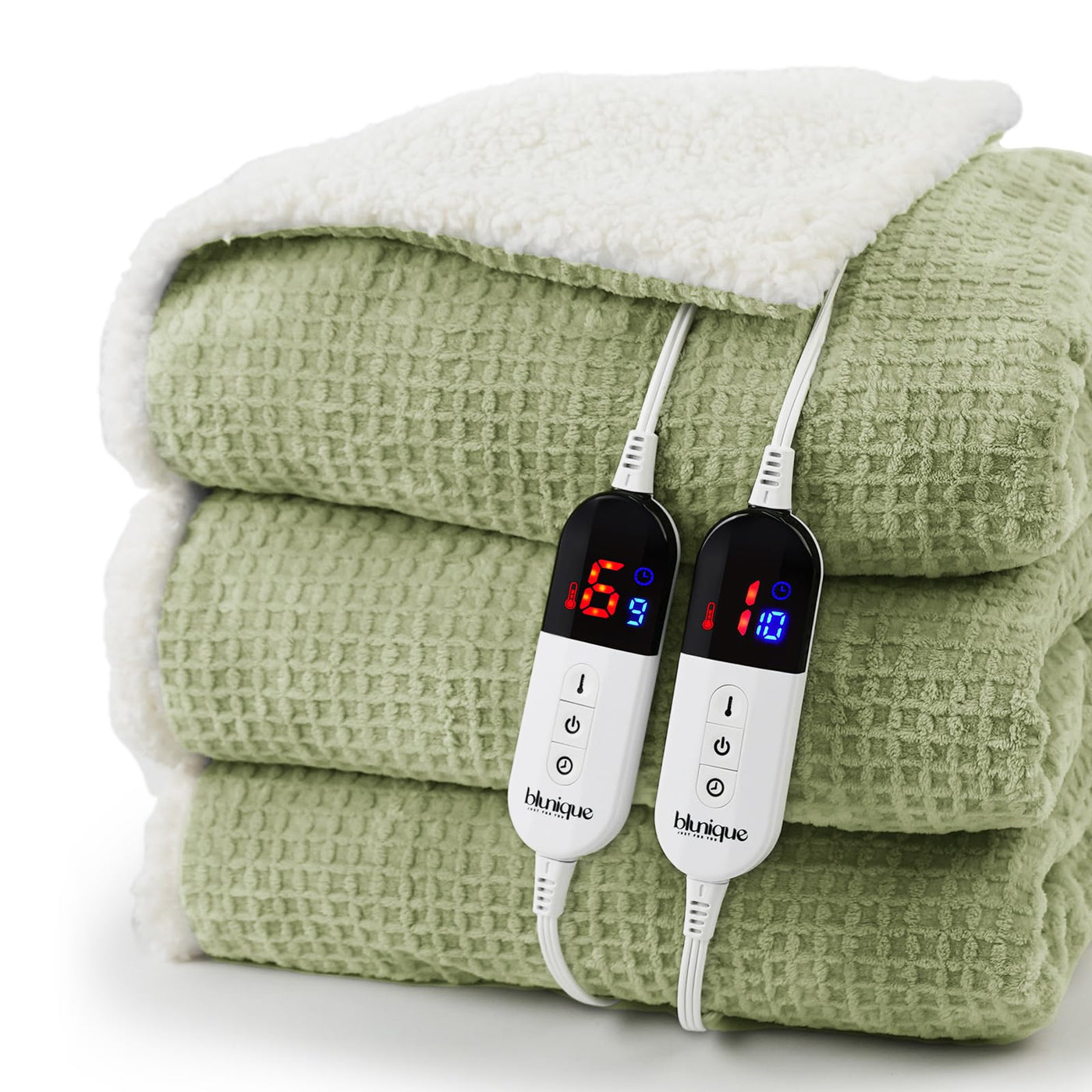 Blunique Heated Blanket Electric Blanket King Waffle, 90X100 Inches Dual Controllers Sherpa Fleece Fast Heating Blanket 6 Heatin