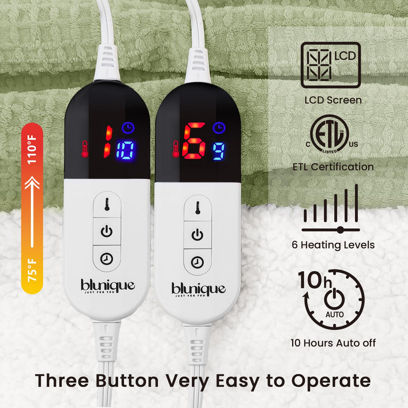 Q: What are the heating levels of the blunique Heated Blanket?A: The blunique Heated Blanket features 6 temperature control levels, allowing you to set the heat between 75°F and 110°F for optimal comfort.