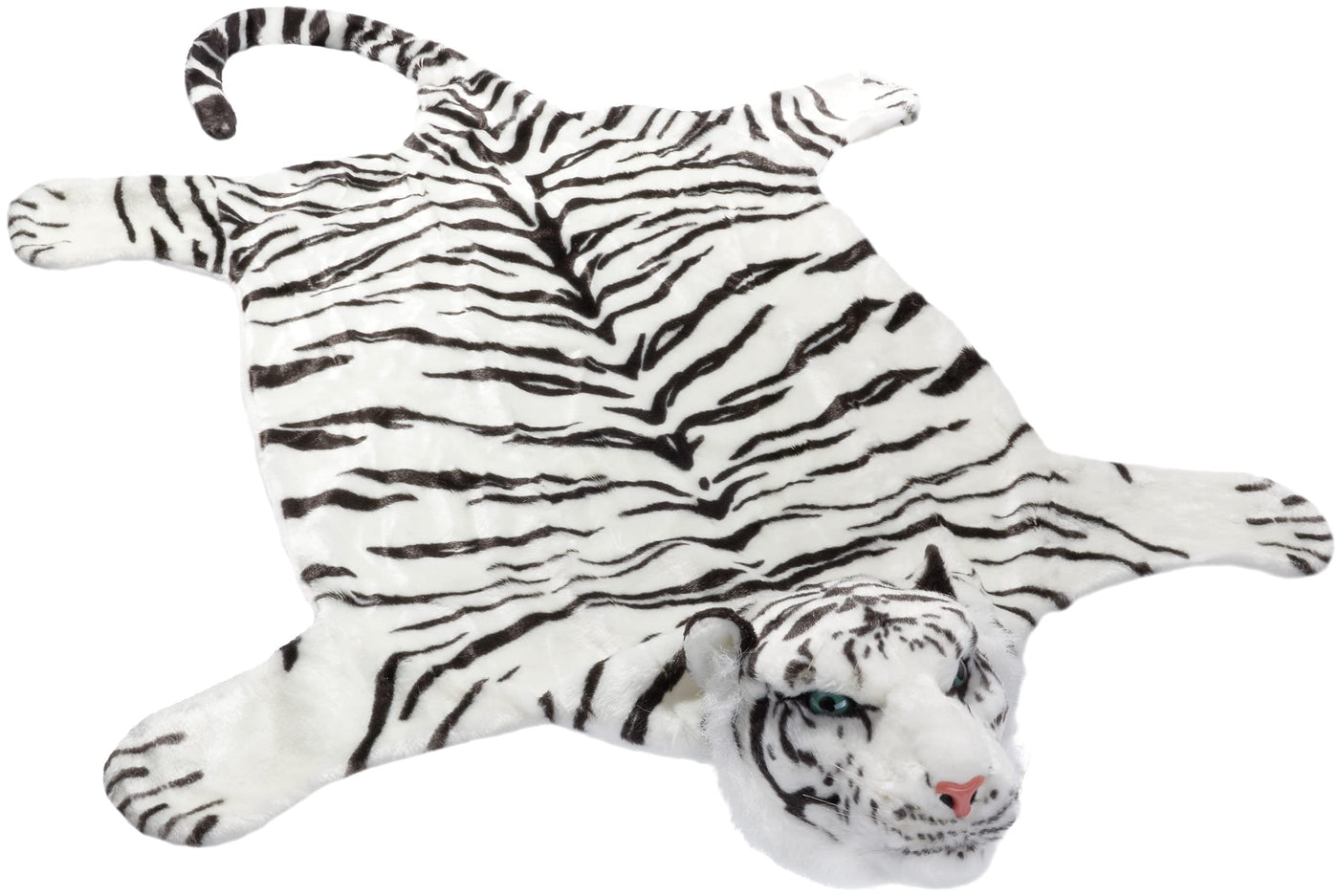 Beautiful white tiger rug Very realistic. Great decoration! Measurements: 78 inches long with tail (51 inches without tail) and 47 inches wide (measured right to left paw)Very decorative and a real eye-catcher. Great for any room! You may put it in front of your fireplace, into your bedroom or into the hall. Never been used or played with and would make an ideal gift for any occasion - especially with Christmas fast approaching!! Soft plush - 100% polyester - perfect workmanship. Washable at 86F (30C)! This rug has the CE label and corresponds with all European norms.
