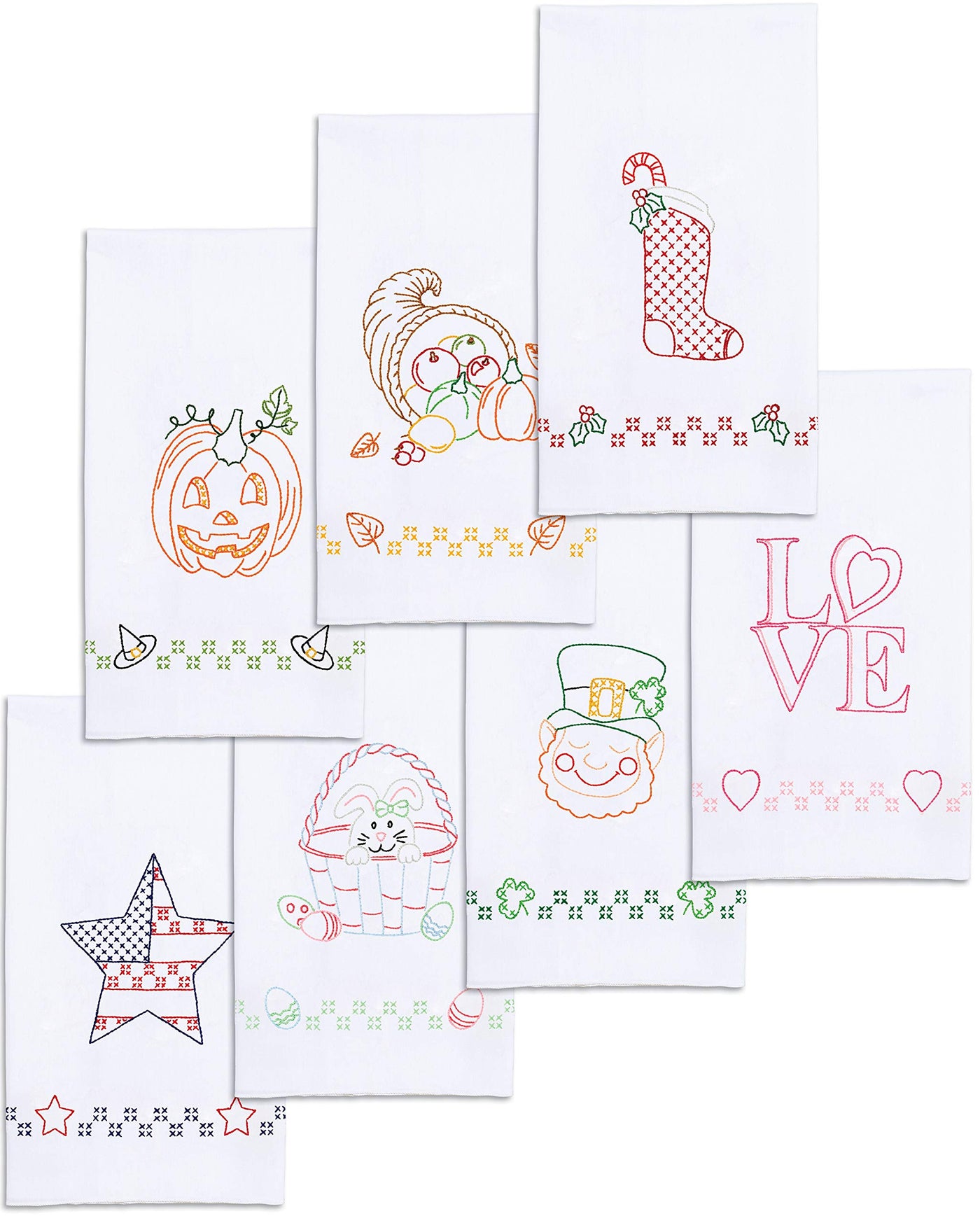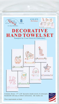 Jack Dempsey Needle Art: Holidays Decorative Hand Towel Set. This Package Contains Seven 17 Inch X 28 Inch White Cotton/Poly Towels. Stamped With Ink That Washes Out. Floss List And Complete Instructions Included. Additional Materials Needed To Complete: Hoop, Needle And Floss.