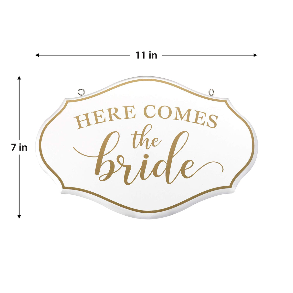 Lillian Rose Here Comes The Bride Flower Girl Ring Bearer Sign. A Unique Way To Usher The Bride Down The Aisle, The Here Comes The Bride Sign Is A Great Way To Include An Additional Child On The Wedding Day. The Sign Can Be Carried By A Flower Girl Or Ring Bearer As An Alternative Instead Of The Traditional Basket Or Pillow. The Playful Sign Is Sure To Bring Some Good Humor As Well As A Polished Look To This Special Occasion. With Its Unique Shape And Smooth Routered Round Edges To Create A Finished Look The Sign Can Easily Be Hung With A Colored Ribbon Of Your Choice Through The 2 Eye Hooks On Each Side. It Is Made Out Of Mdf With A White Painted Finish And Has A Golden Border Edge With Gold Writing. The Sign Measures 11 Inches In Width By 7 Inches In Height And Is . 35 Inches In Depth.