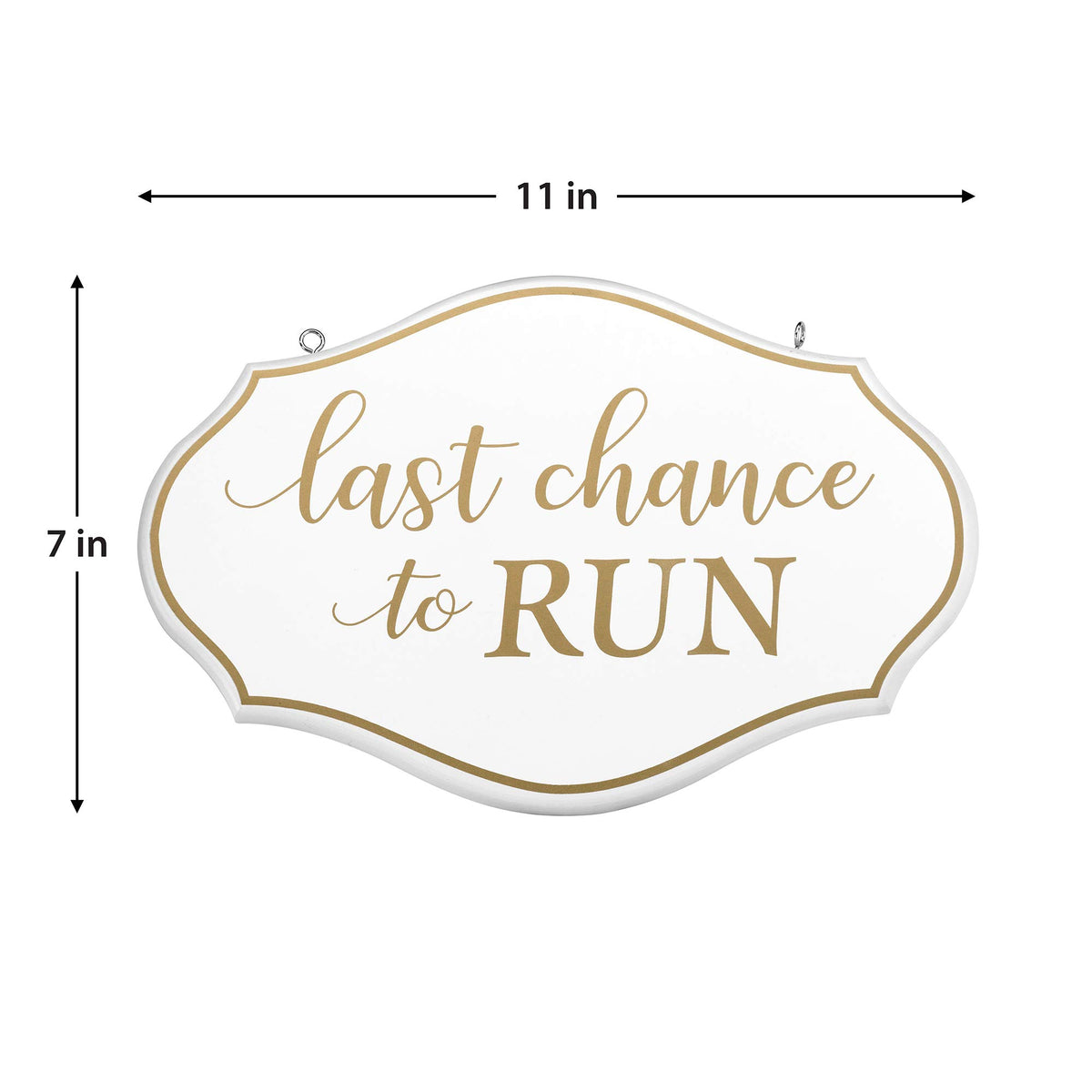 Lillian Rose Flower Girl Ring Bearer Last Chance To Run Sign. The Last Chance To Run Sign Is A Fun Way To Usher In The Bride. The Playful Sign Will Bring Some Humor To The Special Occasion. This Sign Is Also A Great Way To Include Other Children Into The Wedding Who May Have Otherwise Felt Left Out. The Simple Smooth White And Gold Design Is Sure To Match Any Wedding Decor. The Sign Measures 11 By 7 Inches And Is . 375 Inches In Depth.