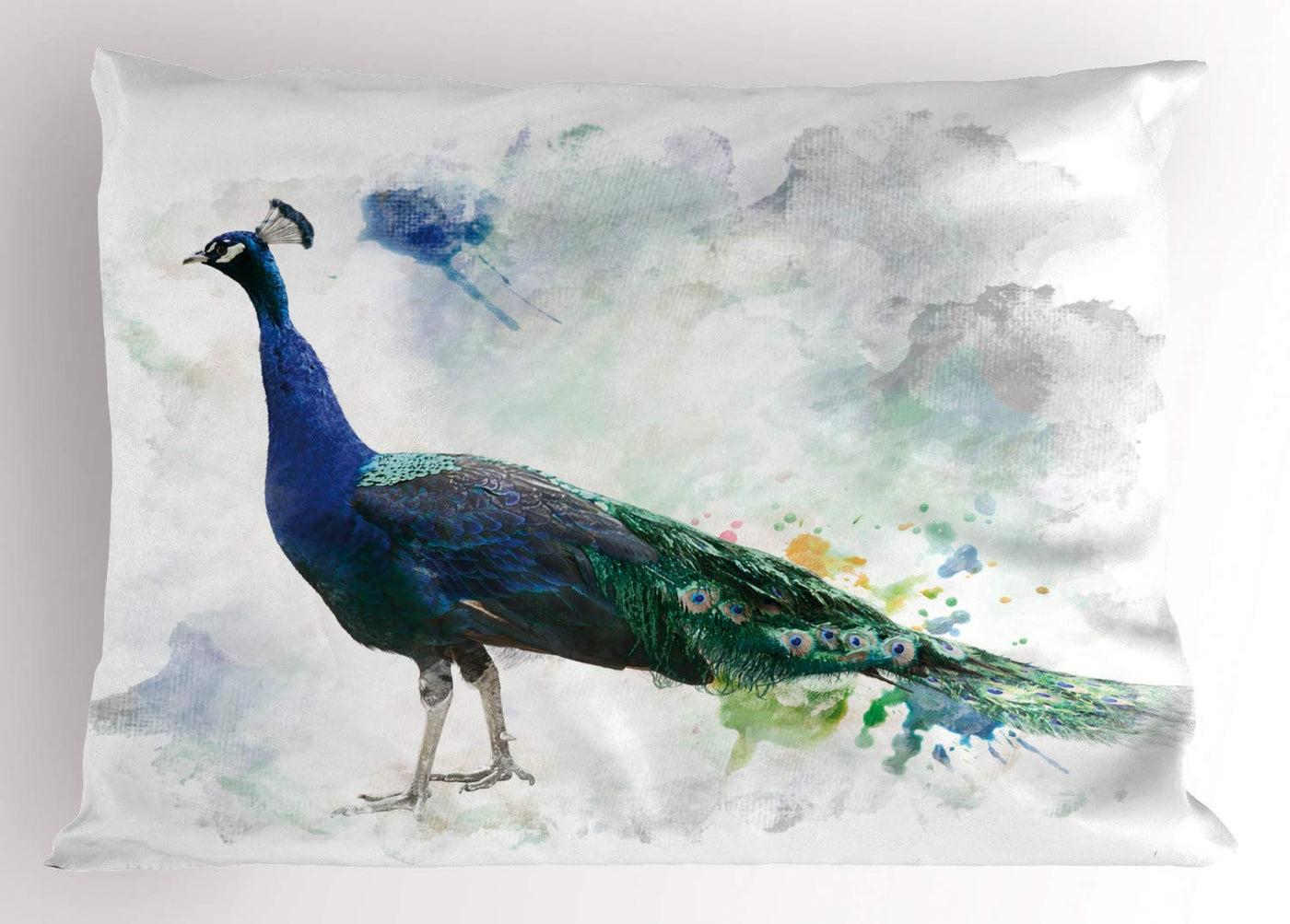 Lunarable Animal Pillow Sham, Digital Watercolor Of Peacock With Colorful Feathers Bird, Decorative Standard Size Printed Pillow