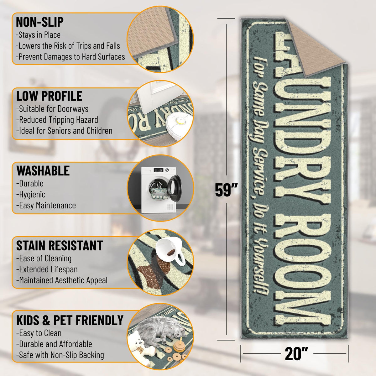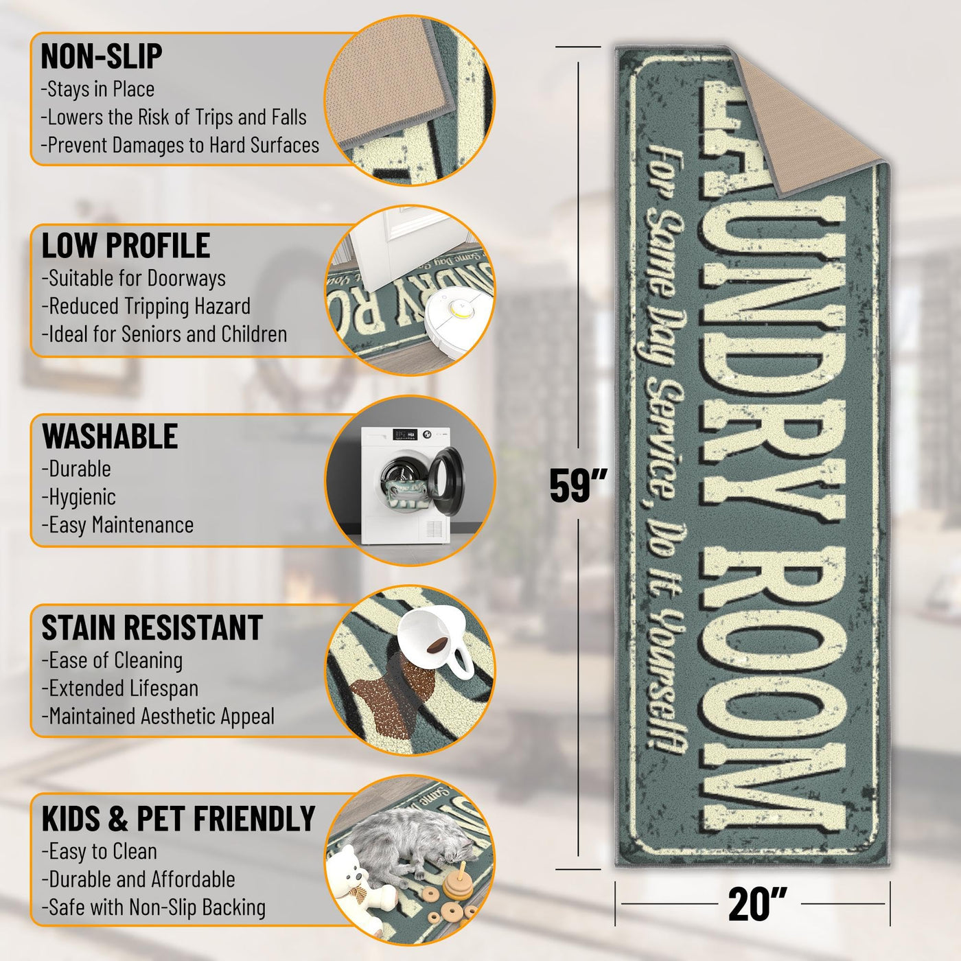 Machine Washable Text Design Rug Non-Slip Rubberback 2X5 Laundry Room Runner Rug For Bathroom, Washroom, 20'' X 59'', Baby Blue
