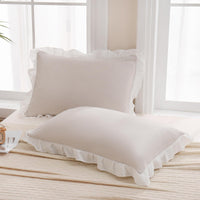 Q: What styles or decor do these pillow shams complement?A: These pillow shams have a solid beige and white color with ruffled fringe design, making them ideal for shabby chic, vintage, or romantic decor styles. They add an elegant touch to any bedroom setting.