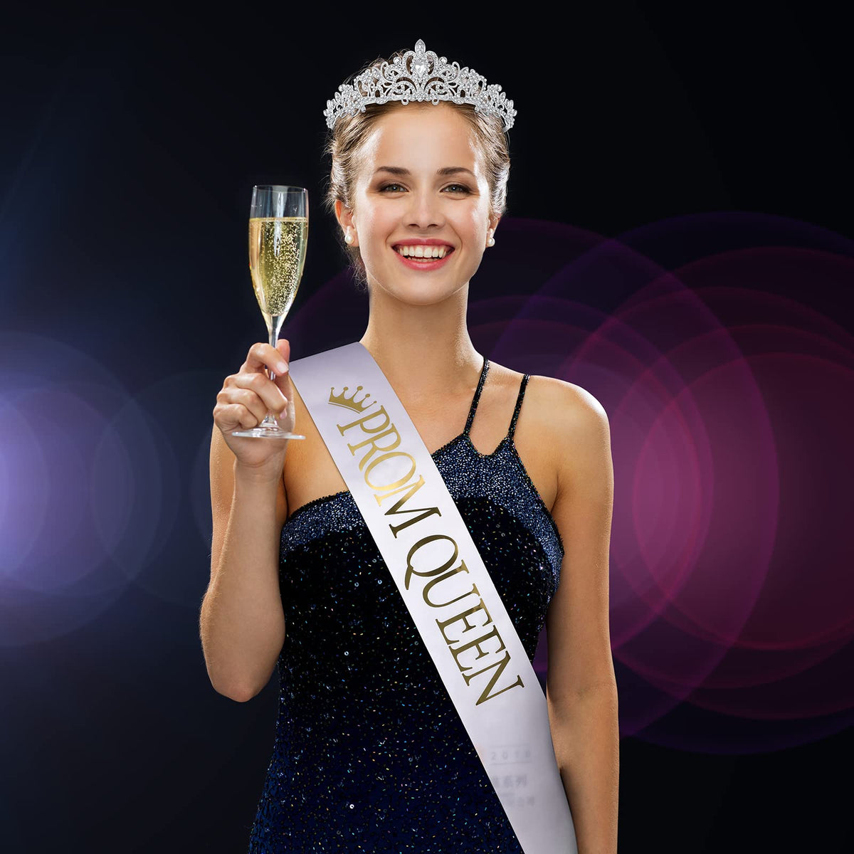 Q: What are the dimensions of the sashes and crowns in this set?A: The prom sashes measure approximately 160 x 9.5 cm (63 x 3.7 inches). The crowns are designed to fit both men and women, with the men's crowns measuring around 7.87 inches and women's crowns about 4.72 inches.