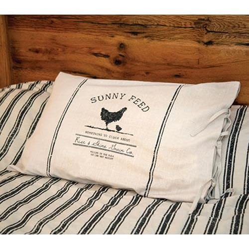 Sunny Feed Farmhouse Stripe King Pillow Sham Is A King-Sized, 100% Cotton Pillow Case. Sham Is Off-White And Has Faded Black Lettering That Reads, 'Sunny Feed - Something To Cluck About - Rise And Shine Grain Co.' And It Is Accented By The Black Silhouette Of A Hen And Chick In The Center. Sham Has Striped Detailing And Features Two Black Lines On Either Side Of The Illustration And It Measures 20' High By 36'' Wide.