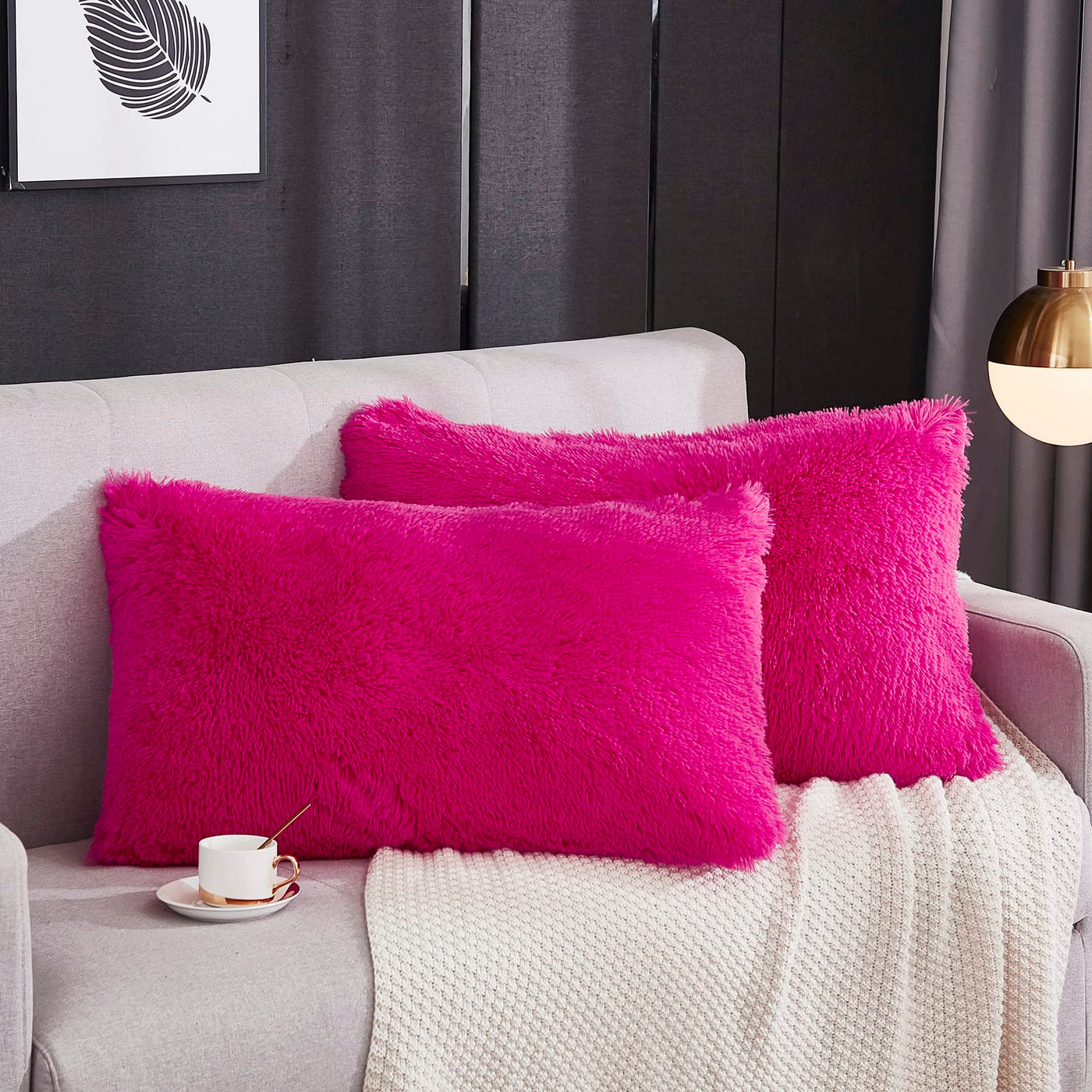 Werdim Shaggy Faux Fur Pillowcases 2 Pack Button Closure Velvet Pillow Shams King Size (Hot Pink, 20 X 36 Inches)
