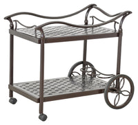 Bridgeton Moore presents the Savannah Tea Cart, this mobile serving cart will make a popular addition for any backyard, the cart comes with wheels for mobility and features a large removable tray top for remote servicing of guests, the bottom tray features beverage bottle holders. From our expanding Savannah Collection, a classic collection featuring a woven lattice design and a brown bronzed powder coat finish. The Cart is cast in 100% aluminum and will never rust. The Savannah Collection offers many other accompanying items enabling you to expand and create your entire outdoor area is this Classic Southern Life Style Collection. The cart requires assembly. Bridgeton Moore has established high quality brand standards and offers one of the best warranties in the Industry, 3 years on all frames and finish under normal conditions, fabrics are all Sumbrella grade and come with a manufacturers supplied two years against any manufacturing defects and or fading from date of purchase. Note * All products used outdoors require reasonable care and that level of care depends on varying external conditions. Covers are recommended for year round outdoor exposure and especially for all coastal applications. Extended exposure in coastal areas can cause corrosion and while this product is used in many coastal applications, they are voided from warranty. Simple hosing down or rinsing off salt exposure if/any will protect and extend the beautiful finish. The fabrics can be easily cleaned in a variety of ways and Sumbrella fabrics are so colorfast they can withstand even the use of bleach.