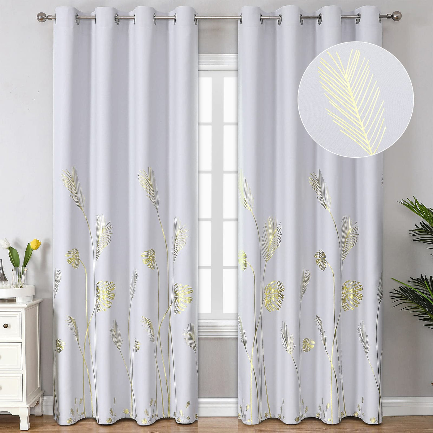 Estelar Textiler Greyish White Room Darkening Curtains 84 Inches Long Gold Palm Leaf And Wheat Pattern Light Filtering Window Cu