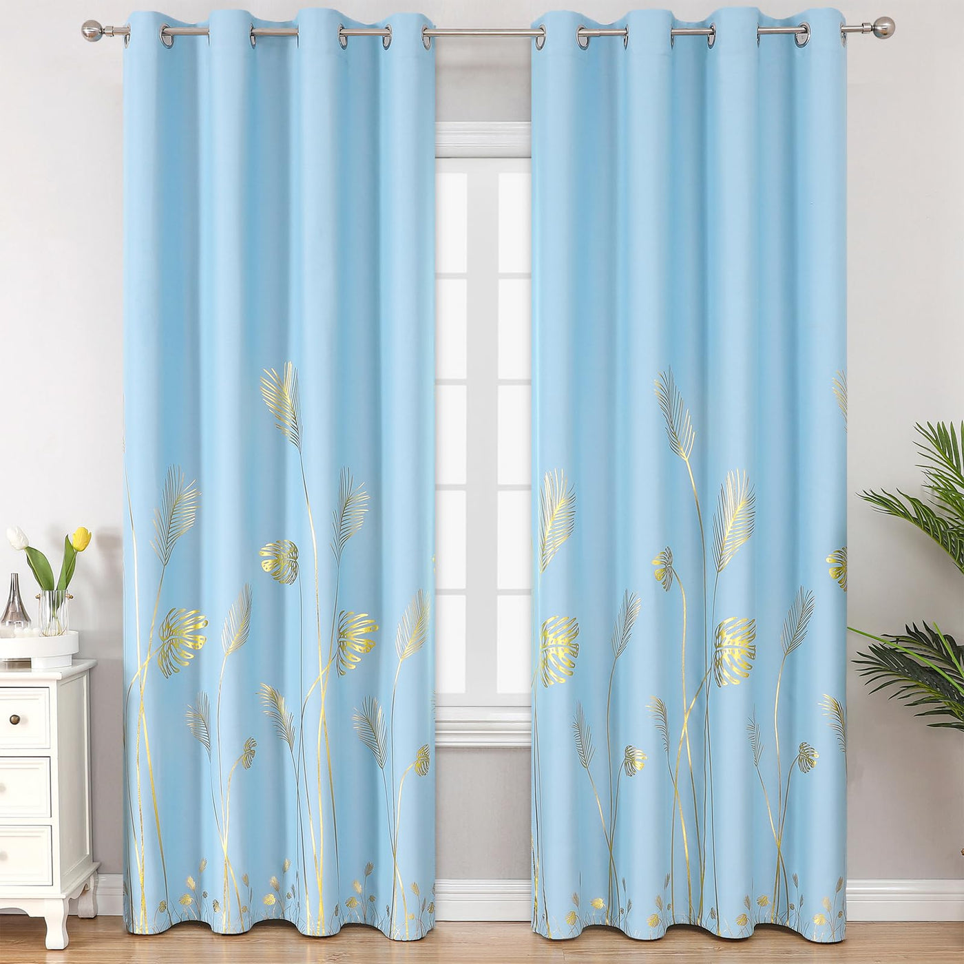 Estelar Textiler Sky Blue Blackout Curtains For Bedroom, Room Darkening Gold Palm Tree Pattern Curtains 96 Inches Long, Light Bl