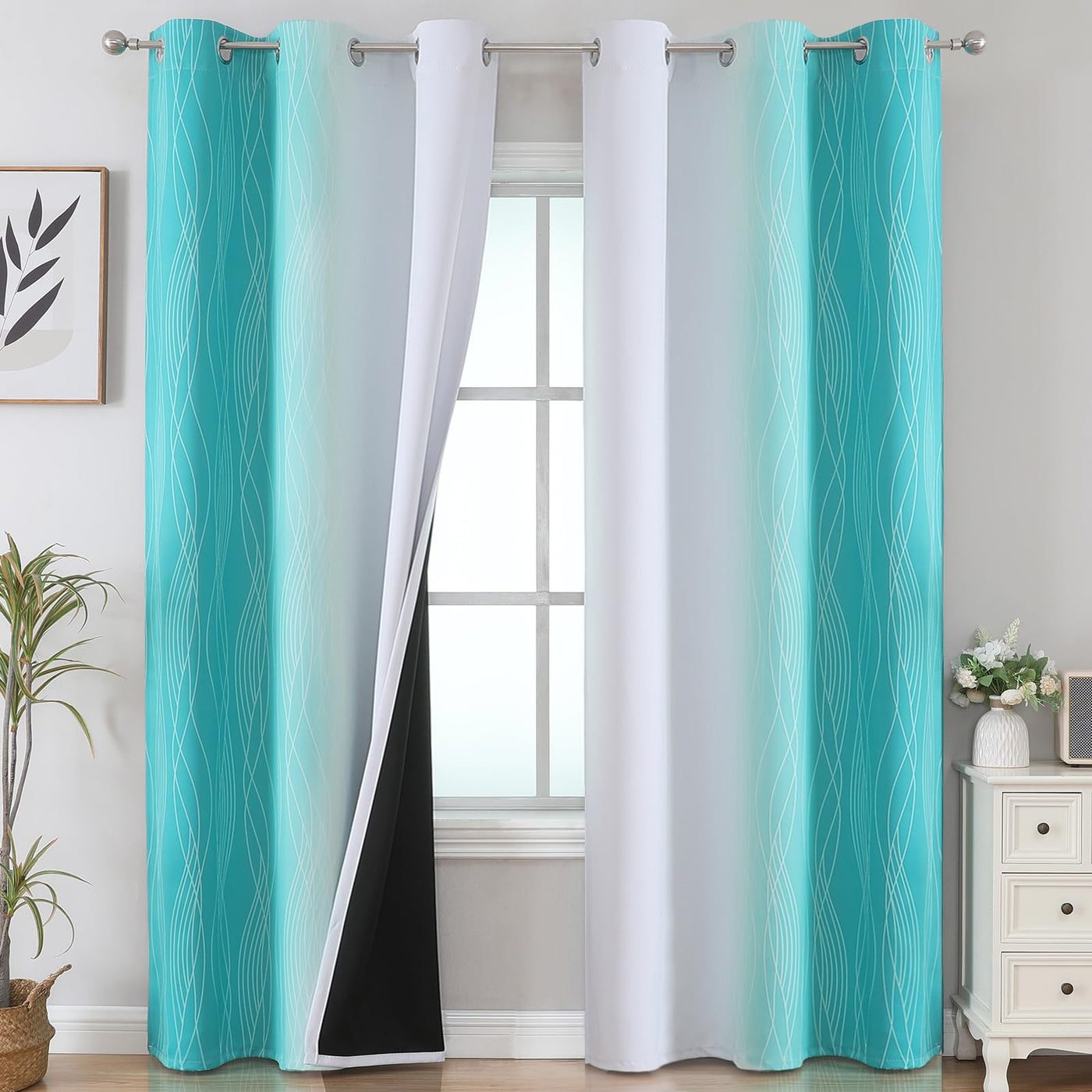 Estelar Textiler Teal And Greyish White Room Darkening Blackout Curtains 84 Inches Long For Living Room, Thermal Insulated Ombre