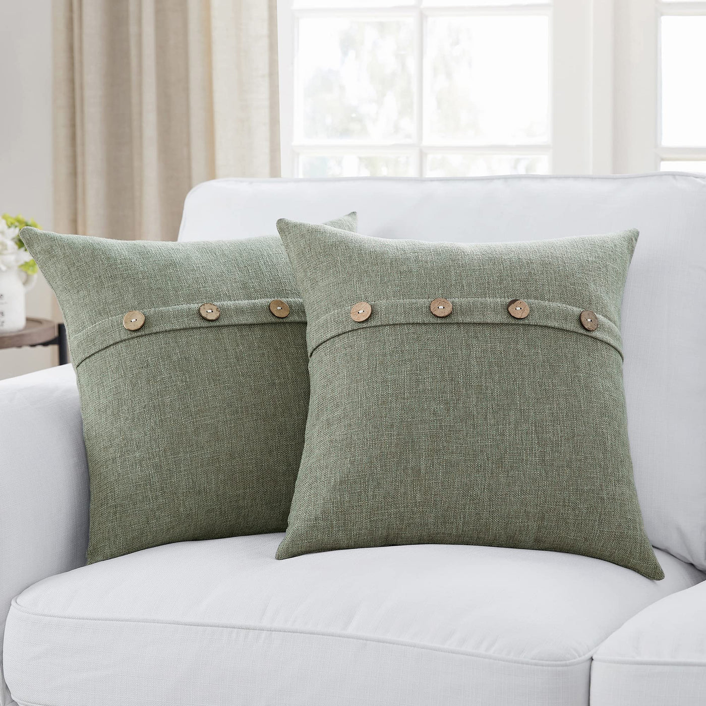 Meekio Set Of 2 Dark Sage Square Pillow Covers 20 X 20 Farmhouse Pillow Covers With Coconut Buttons For Sofa Couch Living Room B