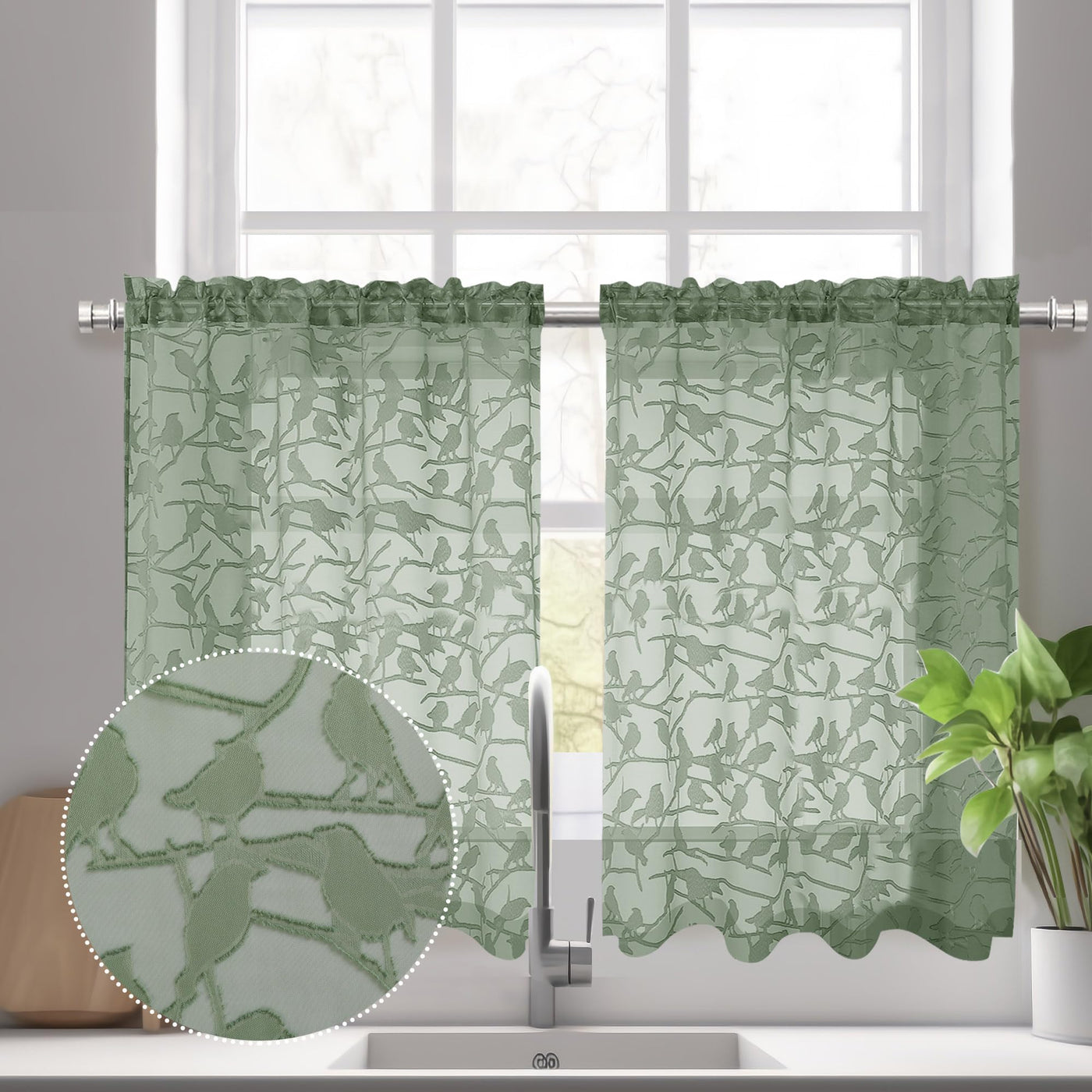 Ovzme Anji Textured Sage Green Kitchen Sheer Curtain Tiers 36 Inch Length 2 Panels Set, Elegant Farmhouse Short Sheer Curtains F
