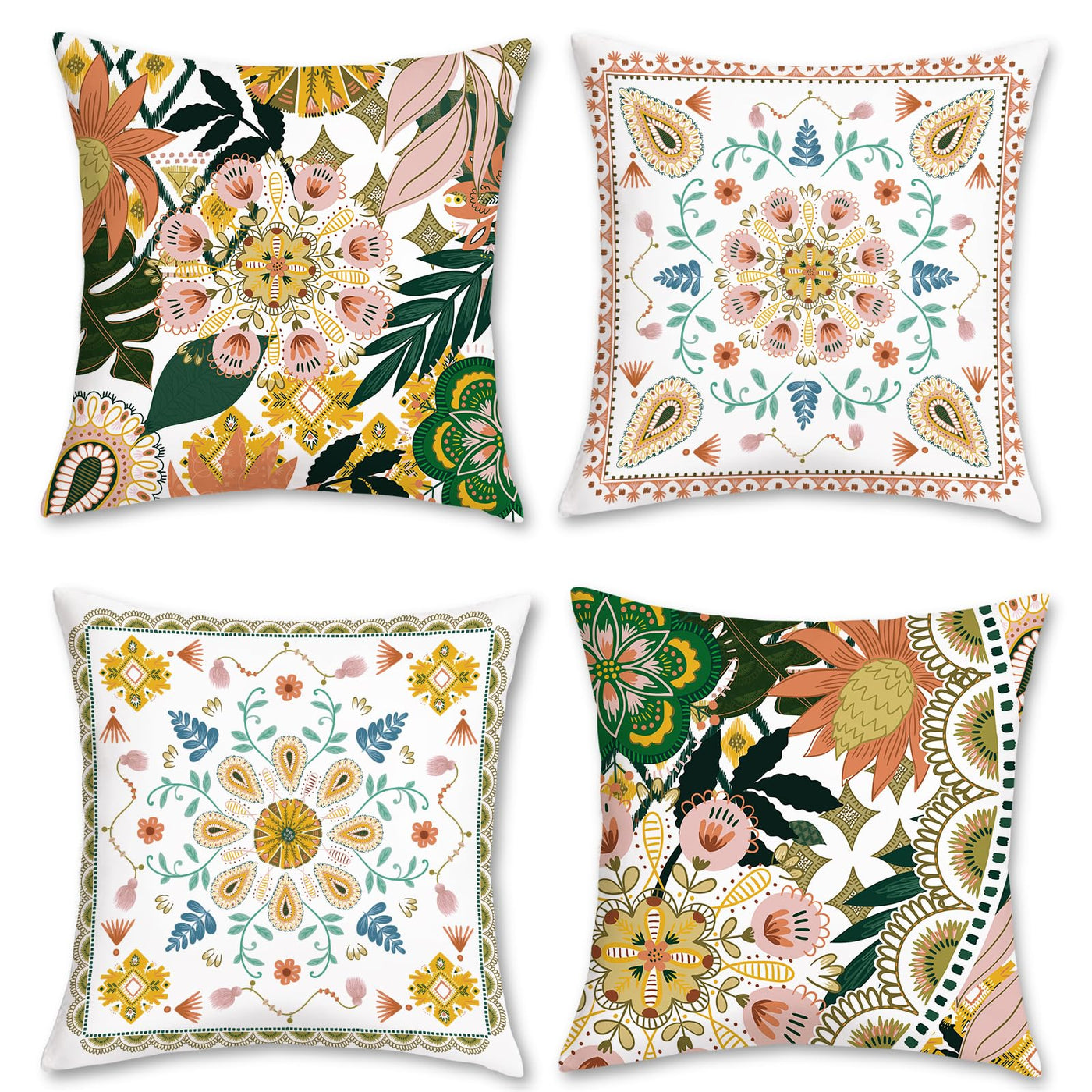 Bonhause Boho Floral Pillow Covers 18X18 Set Of 4 Bohemian Mandala Decorative Throw Pillow Cases Soft Velvet For Sofa Couch Car