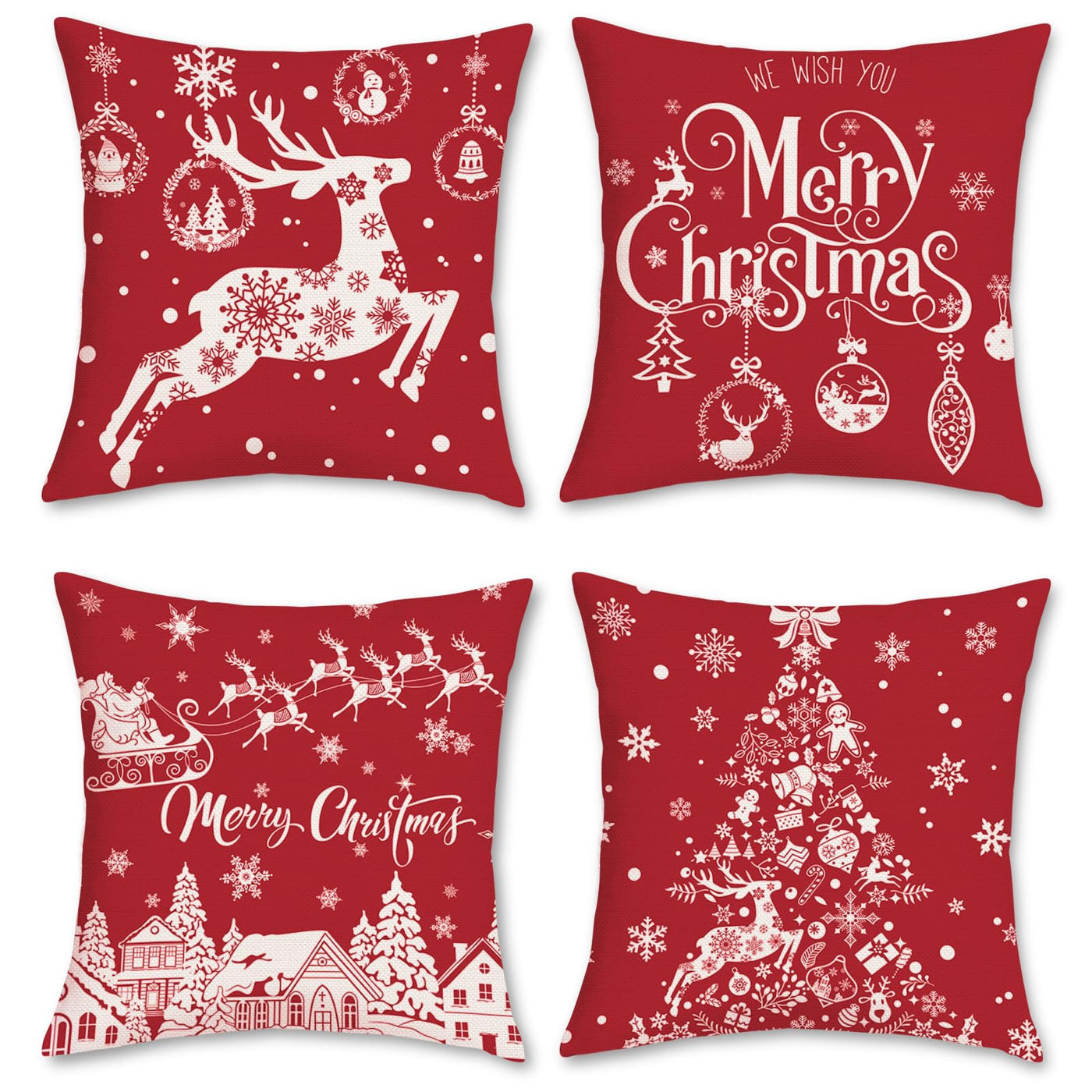 Bonhause Christmas Red Throw Pillow Covers 18 X 18 Inch Reindeer Christmas Tree Snowflake Decorative Pillows For Sofa Couch Wint