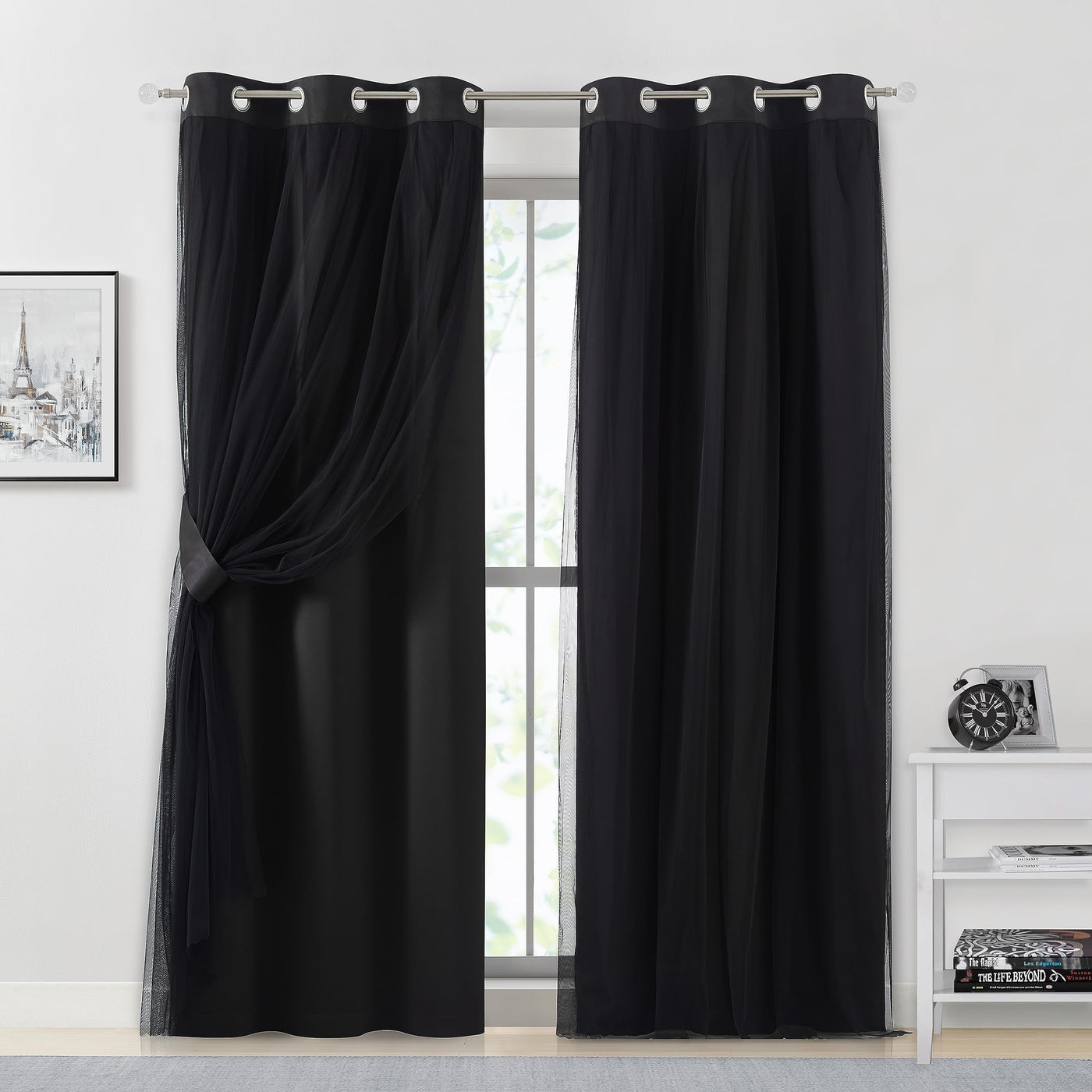 Bujasso Black Full Blackout Curtain Panels With Sheer Overlay Mix And Match Double Layer Thermal Insulated Window Treatment Set