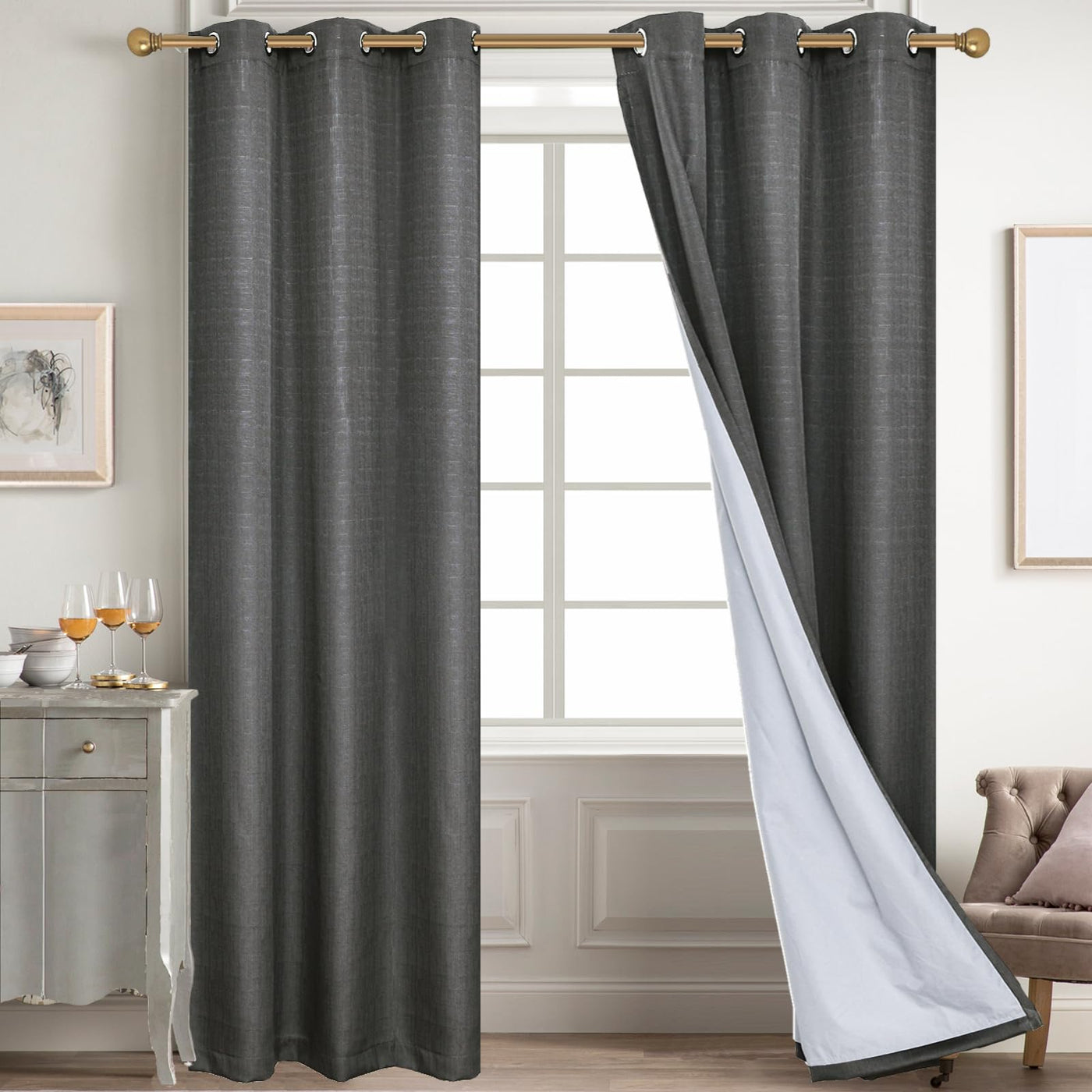 Diraysid 100% Blackout Curtains Dark Grey Linen Curtains For Bedroom Grommet Thermal Insulated Room Darkening Drapes (2 Panels,
