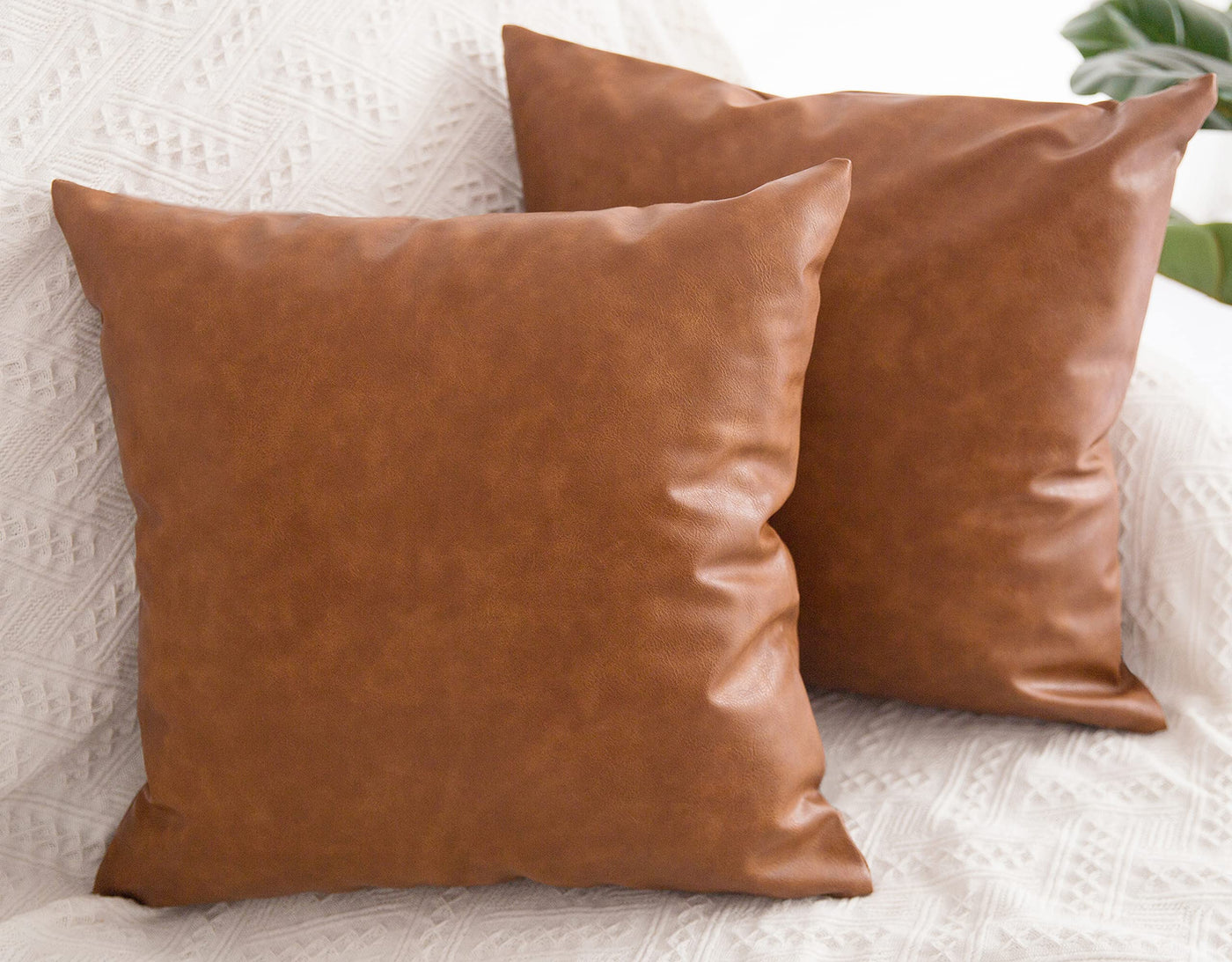 Homfiner Faux Leather Throw Pillow Covers 22X22 Inch, Set Of 2 Thick Cognac Brown Modern Solid Decorative Square Minimalist Cush