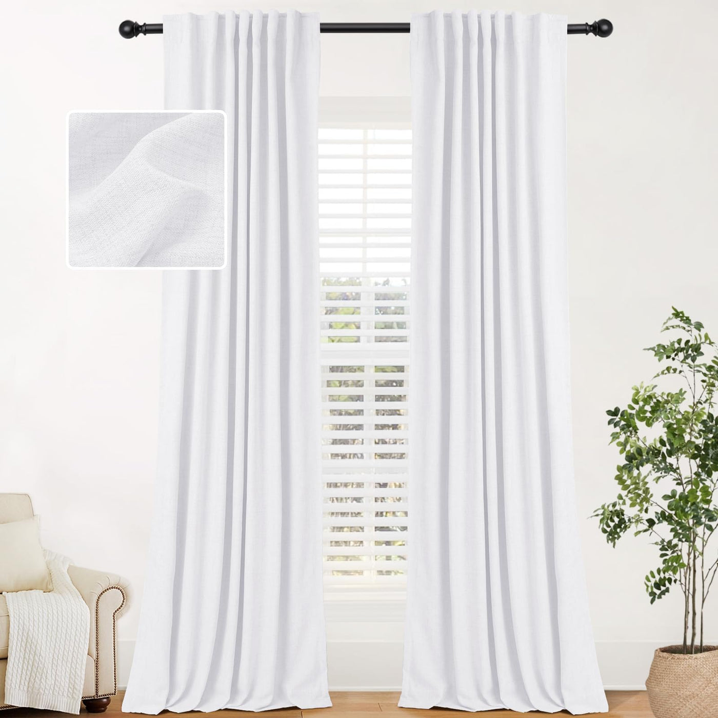 Inovaday 100% White Black Out Curtains 90 Inch Long 2 Panels Set Back Tab/Rod Pocket Linen Blackout Curtains Thermal Insulated R