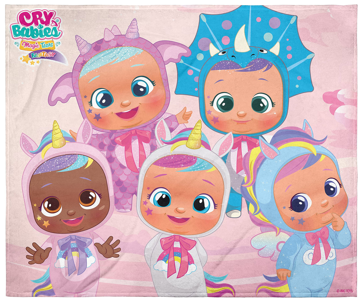 This Is An Officially Licensed Cry Babies Blanket! In Cry Babies Magic Tears Fantasy, Small Babies With Big Personalities Explore An Imaginative World Where Tears Are Magical And Carry Special Powers. This Cry Babies Blanket Features Five Of The Babies From The Hit Tv Show Including Dreamy The Unicorn, Tina The Dinosaur, Jassy The Unicorn, Bruny The Dragon, And Jenna, A Cute Baby Cloud! This Cry Babies Blanket Is Perfect For Young Or Older Fans Alike! Each Plush Blanket Has A Brilliant Color Design Of The Five Babies In Their Dress Up. The Plush Throw Blanket Is Made Of An Extra-Soft And Comfy 100% Polyester Fabric.