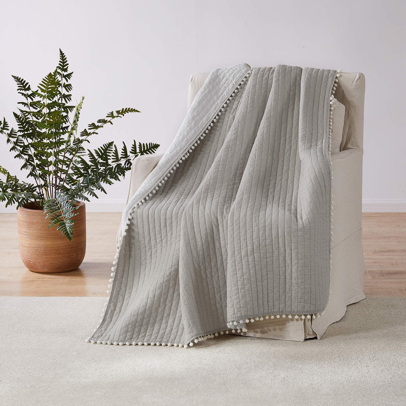 The Pom Pom Reversible Throw By Levtex Home Is Offered In A Beautiful Shade Of Taupe And Will Immediately Transform Your Bedroom. Made With The Softest Lightweight Cotton, This Throw Features Solid Taupe Cotton On The One Side, Reversing To A White Cotton On The Other. The Throw Has A Cotton Rich Filler (90% Cotton, 7% Rayon, 3% Other Fibers) And Is Machine Washable. It Is Perfectly Sized (50X60In.). Enjoy This For Years To Come!