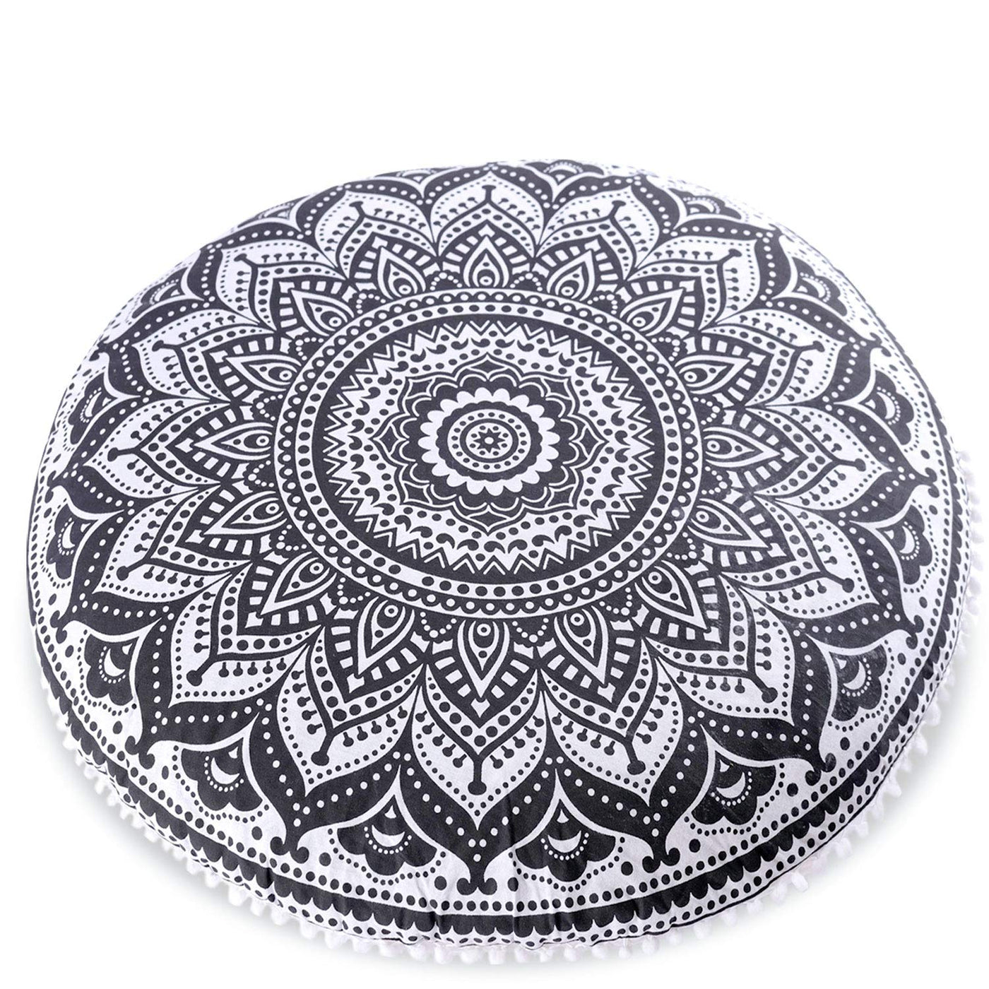 Mandala Life Art Bohemian Yoga D Cor Floor Cushion Cover - Round Mediation Pillow Case - Hand Printed Organic Cotton Pouf (Pouf