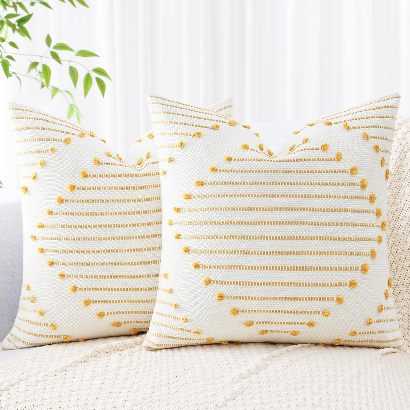 Mecatny Boho Throw Pillow Covers 20X20 Set Of 2, Farmhouse Decorative Pillow Covers For Couch Sofa Living Room, Yellow & White