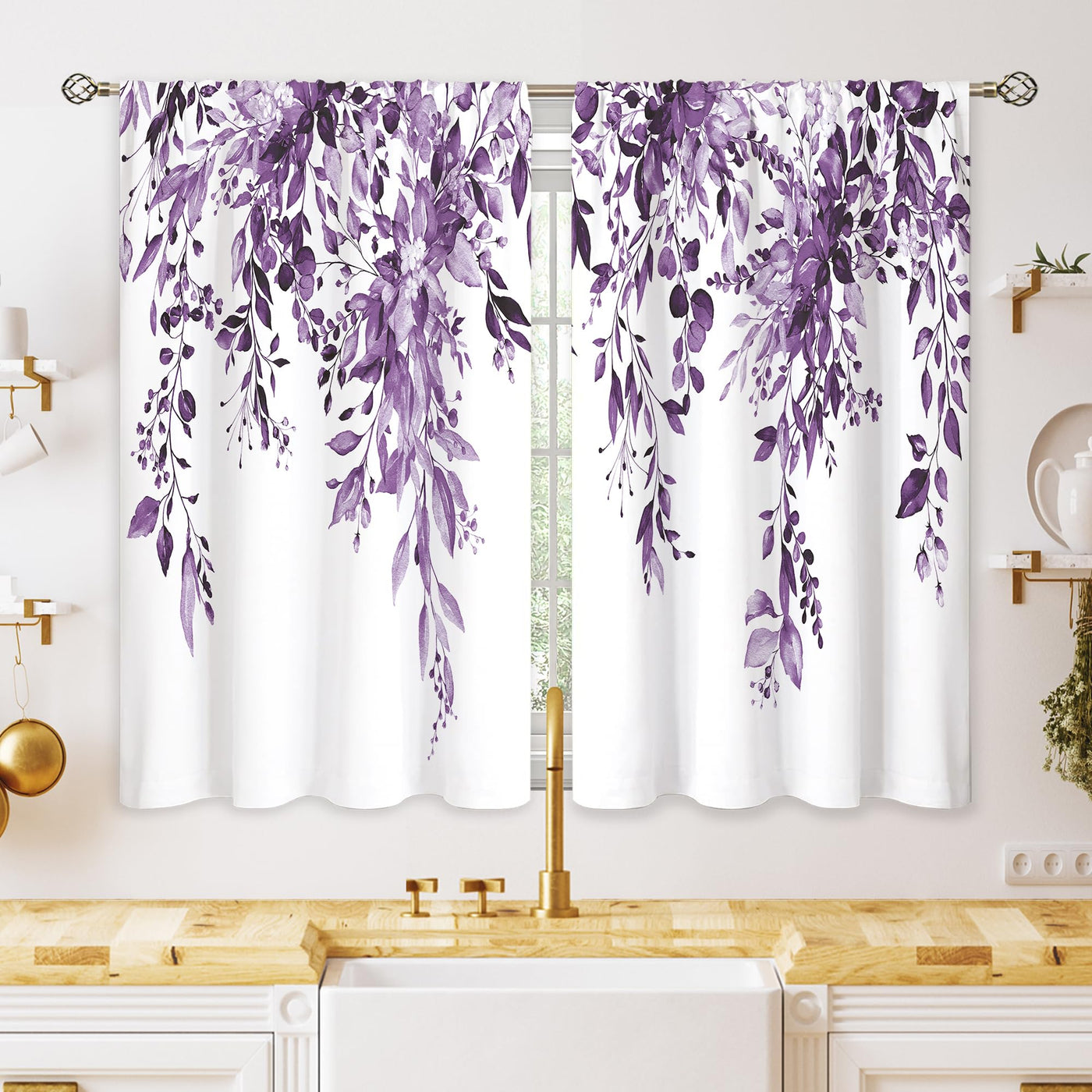 Oolygoo Eucalyptus Botanical Leaves Purple Floral Kitchen Window Curtains Over Sink Farmhouse Flower Leaf Small Window Treatment