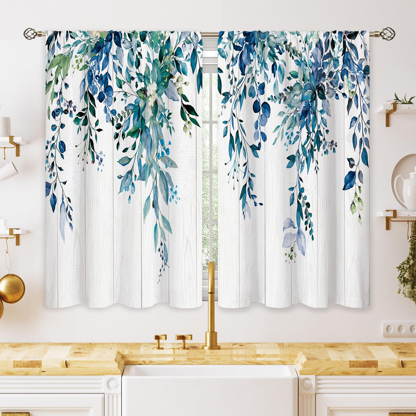 Oolygoo Farmhouse Teal Eucalyptus Small Kitchen Curtains Blue Leaves Window Treatment Turquoise Wooden Cafe Short Curtains For B