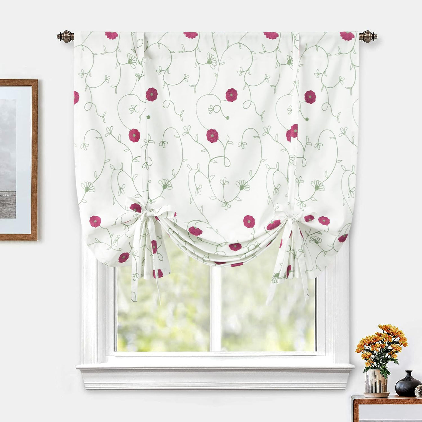 Vogol Tie Up Shades For Kitchen, Pink Flower Embroidered Adjustable Tie-Up Curtains Rod Pocket 63 Inches Long White Linen Small