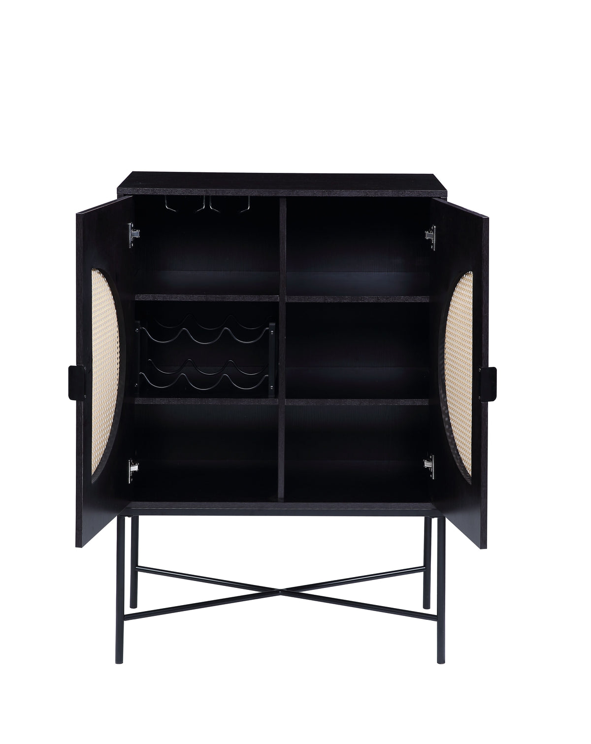 The black wooden cabinet features a rattan insert on the front panels and a contemporary metal frame with a black finish to enhance any home decor. A stylish and tidy space to hold your wine and liquor bottles along with glasses of different sizes.