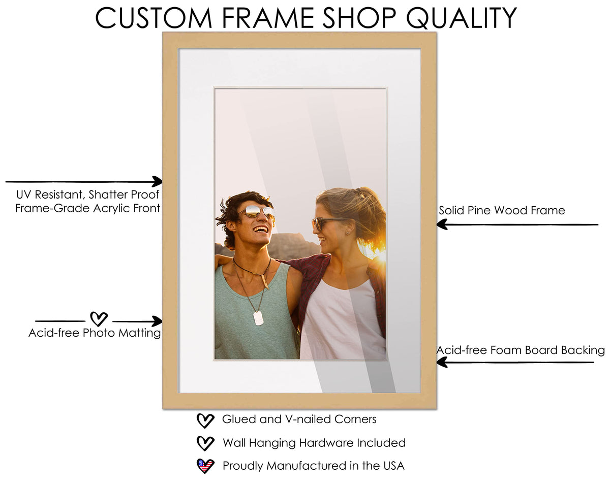 11X22 Natural Frame For 11X22 Picture Or 13X24 Art Poster Without White Photo Mat. The Included White Picture Matte Is Acid-Free To Protect Your Prints, Pictures, Posters, Photos, Fotos, Or Puzzle. This Natural Frame Is Constructed From Pine Wood. Great For Your Walls Decor, Boho Theme, Canvas Art, Kitchen Art, Rustic Art, Livingroom Art, Neutral Theme, Painting, Drawing, Industrial, Mirror Art. Each Frame Includes Uv Resistant, Shatter Guard, Frame Grade Acrylic, In Place Of Standard Glass. Acid-Free White Foam Board Backing And Metal Hanging Hardware Are Also Included. Great For Collages! Easily Assemble Your Own Gallery Wall Frame Set Or Wood Frames Collage By Combining Several Black, White, Silver, Or Natural Frames To Create Your Own Wooden Frame Wall Grid. Add To Your Home Aesthetic Wall Decor With Our Custom Picture Frames. Each Wooden Photo Frame Is Made In The Usa To Compliment Any Modern, Contemporary Decor Or Farmhouse Decor Theme.