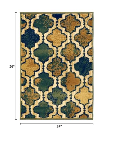 This 2' x 3' green quatrefoil power loom distressed stain resistant area rug, is a great way to add warmth to a room. This rectangle shaped rug features a quatrefoil design in green to give it visual interest. A classic shape marries with good looking design for your space Made in Turkey, this rug offers high quality combined with good looking designer sensibilities. Ideal for kids and pets, this rug is stain resistant to repel repel stains and spilled liquid. ids. Area Rugs help to give warmth and sense of home to your space. 0.31' H x 24' W x 36' D