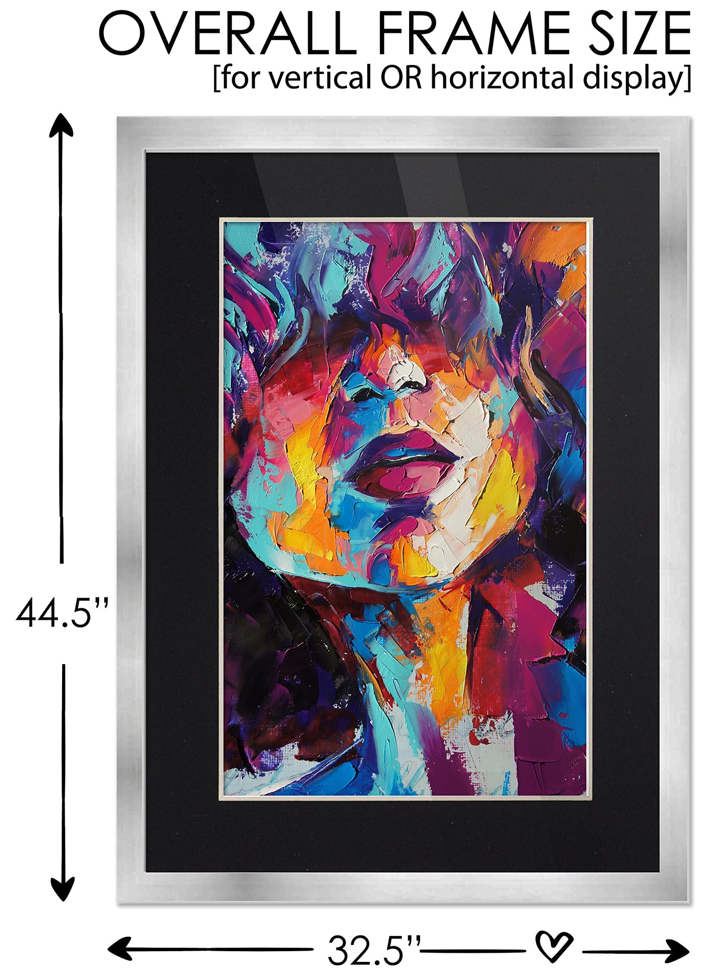Q: What size artwork can I display in this frame?A: This frame is designed to hold a 28x40 picture or a 31x43 art poster when using the included black mat.