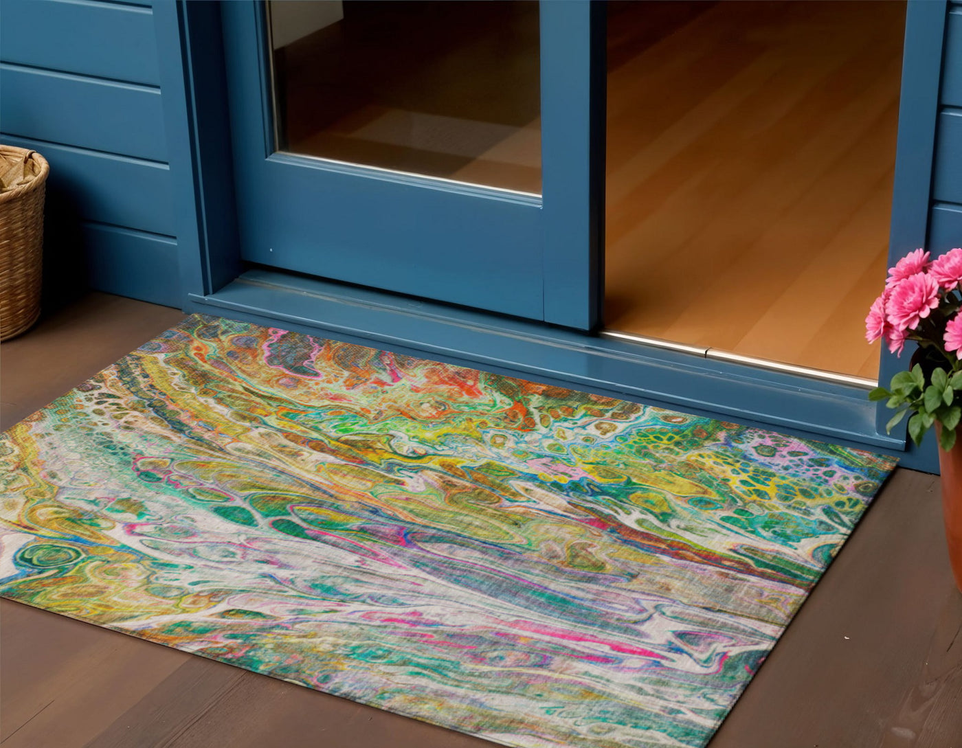 3' X 5' Green Gold And White Abstract Washable Indoor Outdoor Area Rug