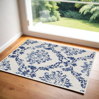 3' X 5' Ivory and Navy Blue Damask Distressed Area Rug