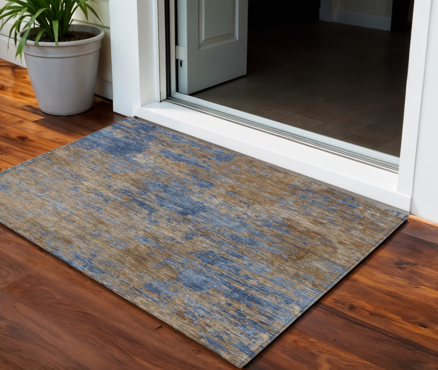 3' X 5' Navy Blue And Brown Abstract Washable Indoor Outdoor Area Rug