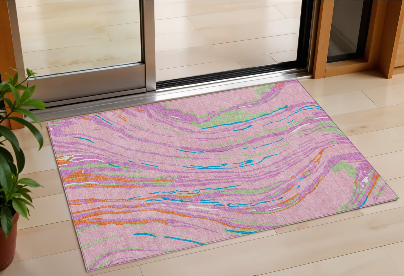 3' X 5' Pink Green And Teal Blue Abstract Washable Indoor Outdoor Area Rug