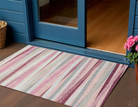 3' X 5' Pink Ivory And Gray Striped Washable Indoor Outdoor Area Rug