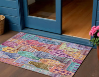 3' X 5' Red Gold And Teal Blue Village Houses Washable Indoor Outdoor Area Rug