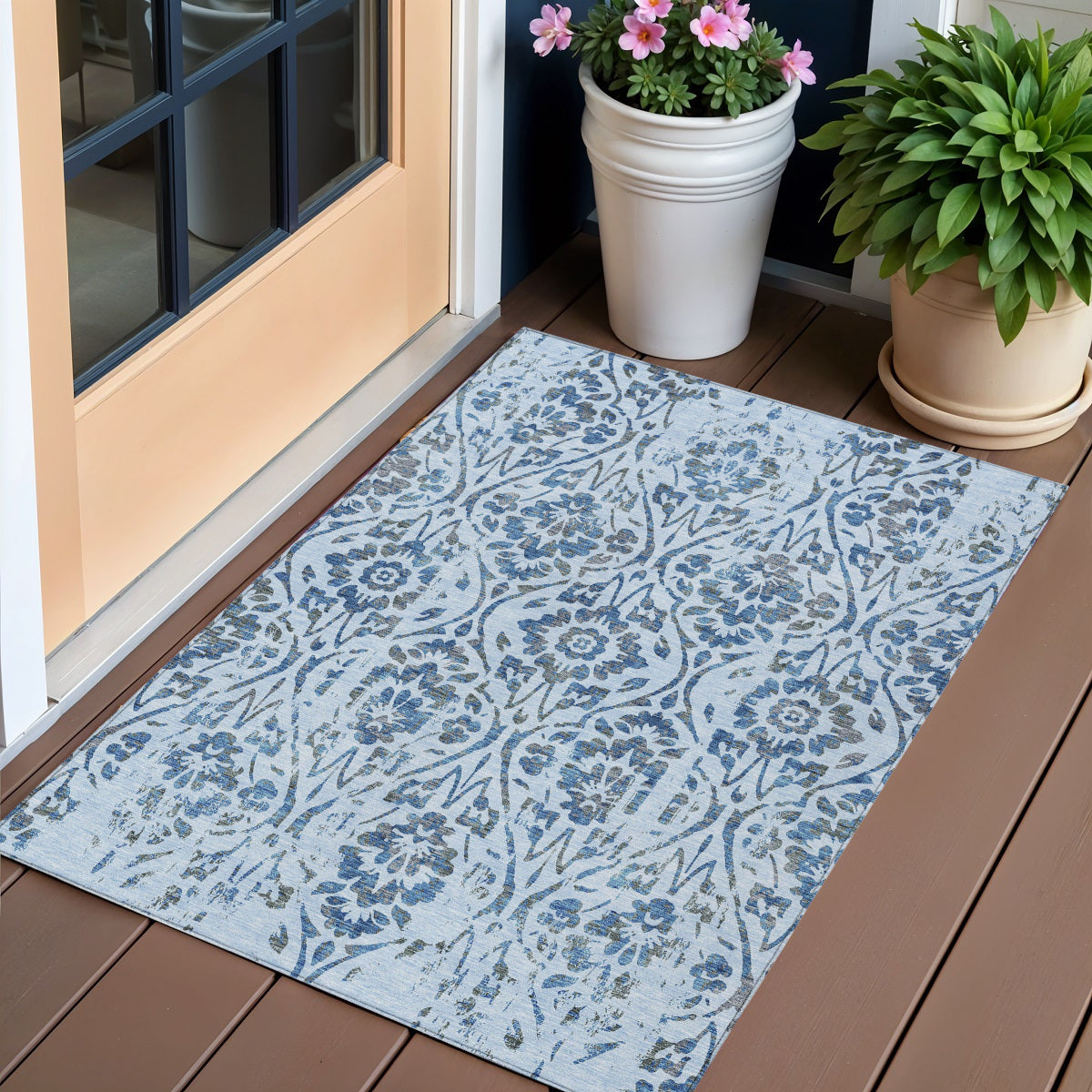 3' X 5' Sky Blue And Dark Blue Floral Washable Indoor Outdoor Area Rug