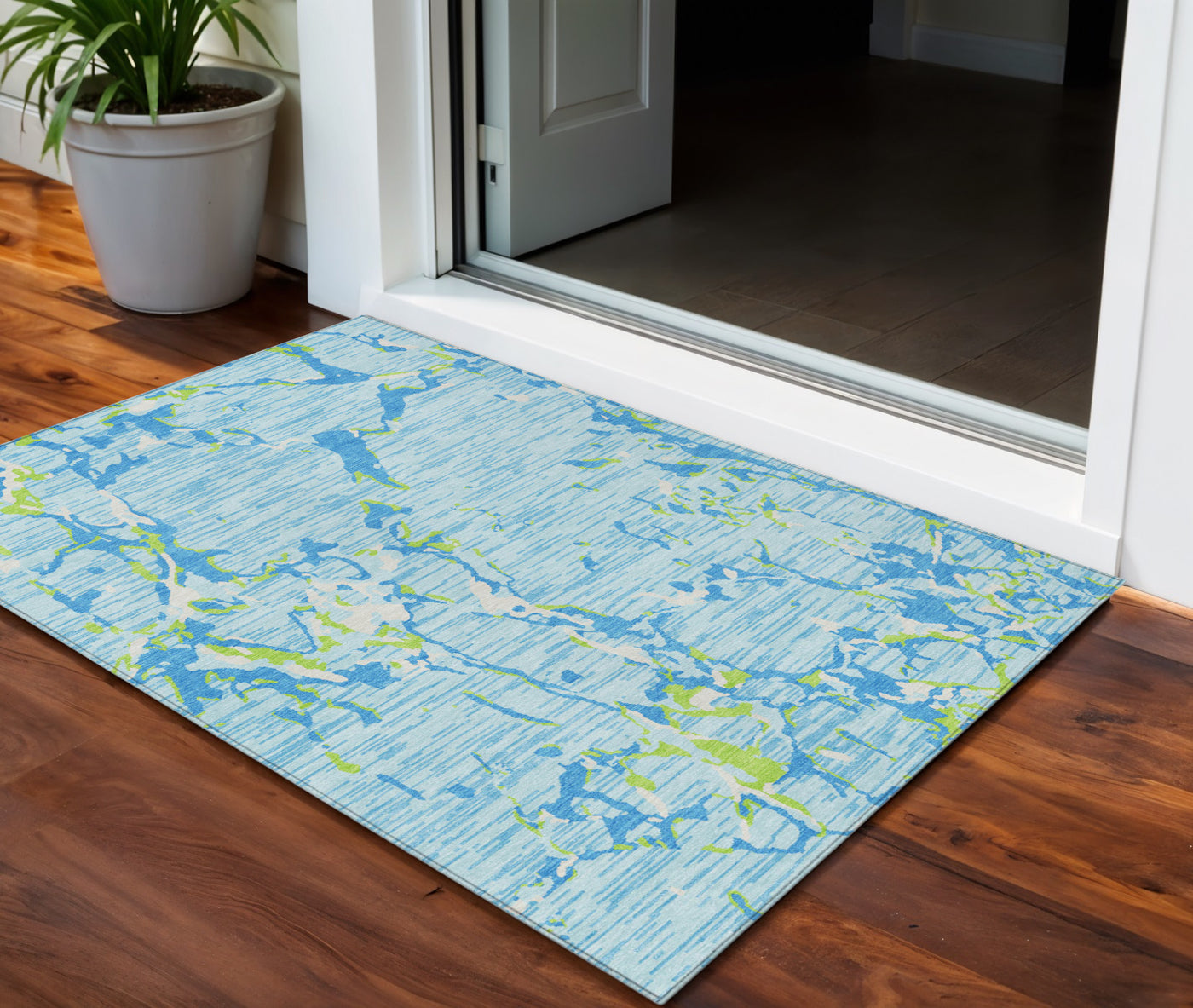 3' X 5' Sky Blue Green And Ivory Striped Washable Indoor Outdoor Area Rug