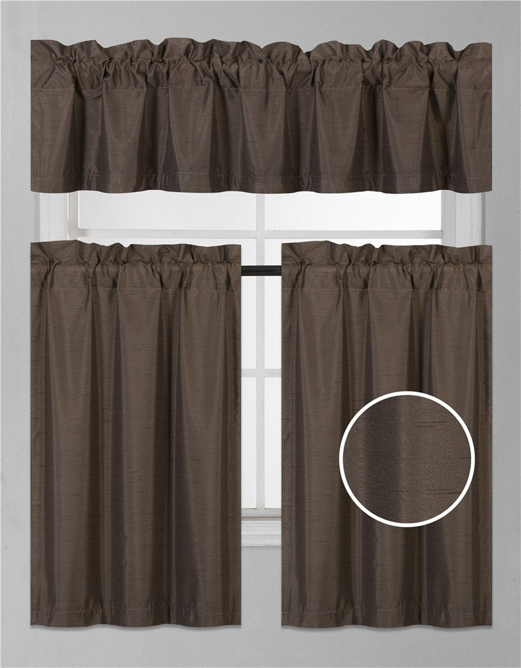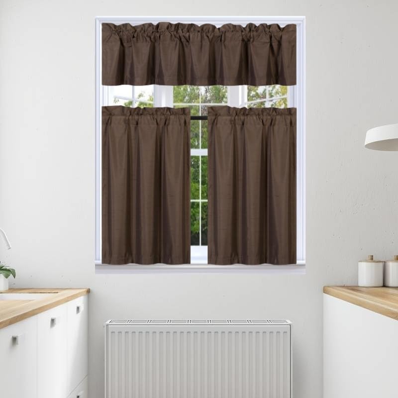 3Pc Set Solid Faux Silk Lined Blackout Rod Pocket Small Kitchen Window Curtain With Valance (K3) (Brown Coffee)