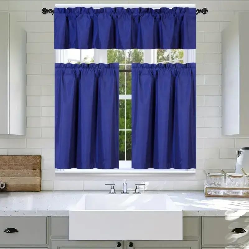 3-Piece Set Includes: 1 Faux Silk Valance With Foam Backing Size 60'' Wide X 14'' Long 2 Faux Silk Tiers Panel With Foam Backing Size 30'' Wide X 36'' Long (Each Tier) Decorate Your Kitchen Area With This Blackout Window Treatment, Keep Your Kitchen Looking Classically Chic With These Solid Curtains. The Lined Window Curtain Tiers Set Add Style To Your Windows And Match Any Kitchen Decor You Have And Quickly Enhance Any Room. Perfect For Your Kitchen Or Any Dining ,Garage, Hallway ,Laundry Window With This Be Autiful House Warming Curtain Set Made With 100% Polyester .
